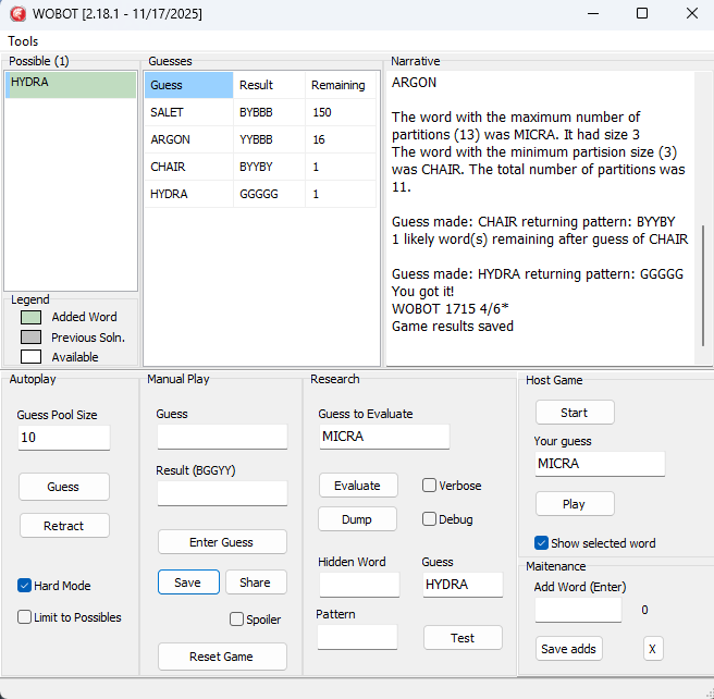 WOBOT is at version 2.18.1. Changes last year include the ability to fall back onto the full dictionary when the solution is not on the researched solutions list. Another is an automated way to add words to the possible solutions list based on the Times analysis of a current game. My belief is that the current NY Times possible solutions list contains 3,200 words. My list has 3,218 — 18 extra words.