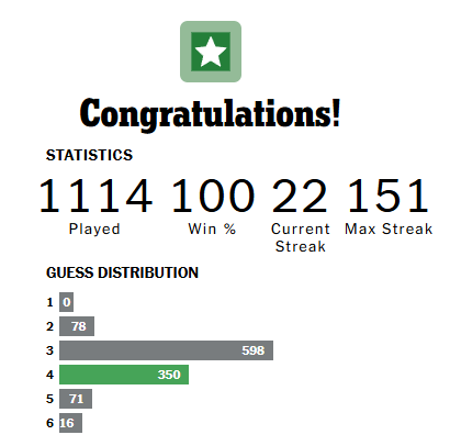 For some reason the two games I failed to solve in 6 guesses were not counted by Wordle, and the Times thinks I’ve always won. Usually, I solve it in 3 guesses, never in one because my starting guess isn’t on the solutions list.