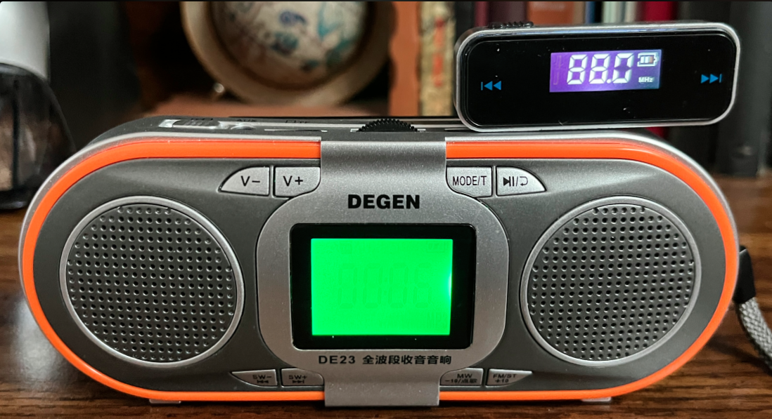 For FM, I’m using an inexpensive FM transmitter hooked up to a known stereo device playing the MP3 file. I verified that this Beinhome FM Transmitter I bought in 2022 transmits stereo. My Degen DE23 radio is stereo for both FM and MP3. Because it will play an MP3 file over and over, I selected it to supply signal to the FM transmitter. The pair makes a potent broadcaster.