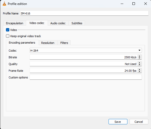 Click Save, and select the new profile for your Convert tab, fill in the output file name and click Start.