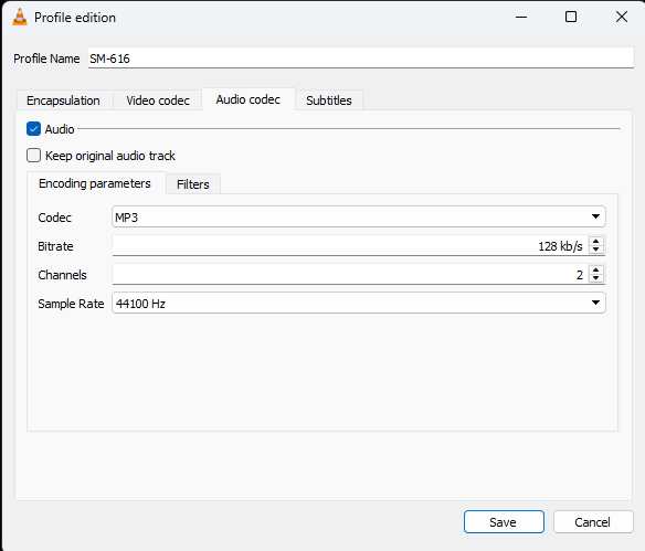 - On the Convert dialog, select Convert and press the small button to the far right of “profile” to create a profile for the SM-616. I named it “SM-616.”