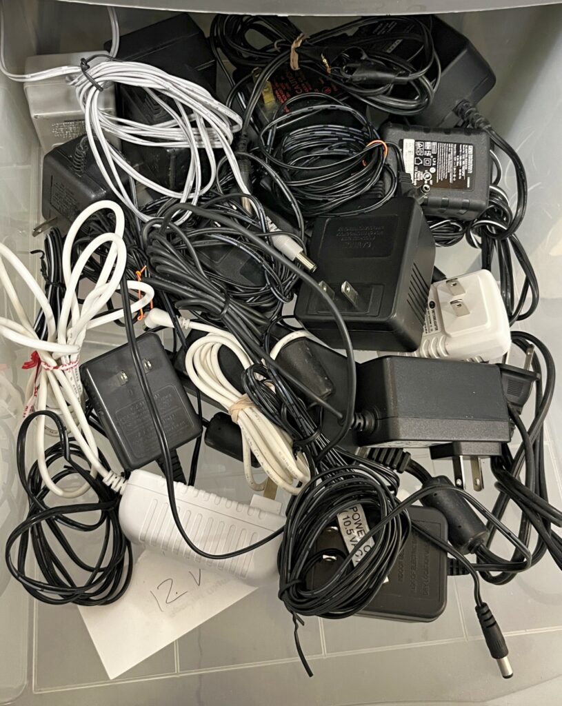 So, anybody bring a 12V power supply? No problem, I’ve been throwing AC power supplies into drawers for over 40 years. The photo below is just the 12V drawer. The first one I pulled out, something from DIRECTV, has the right polarity and seems to fit.
