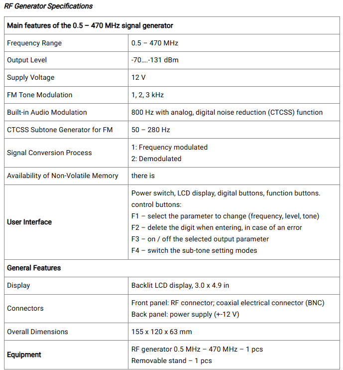 The device is designed to generate high-frequency signals at frequencies of 0.5 MHz – 470 MHz, with the possibility of their modulation by an audio signal with a frequency of 800 Hz. Allows you to smoothly adjust the RF signal strength within -70 – 132 dBm. It can be used to measure the sensitivity and selectivity of the receiving paths of various devices, as well as for other purposes.