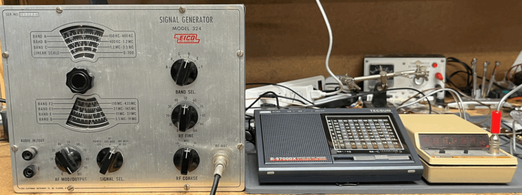 Here’s a more recent photo of the EICO 324 and a frequency counter testing the dial accuracy of my Tecsun R-9700DX (not very accurate).
